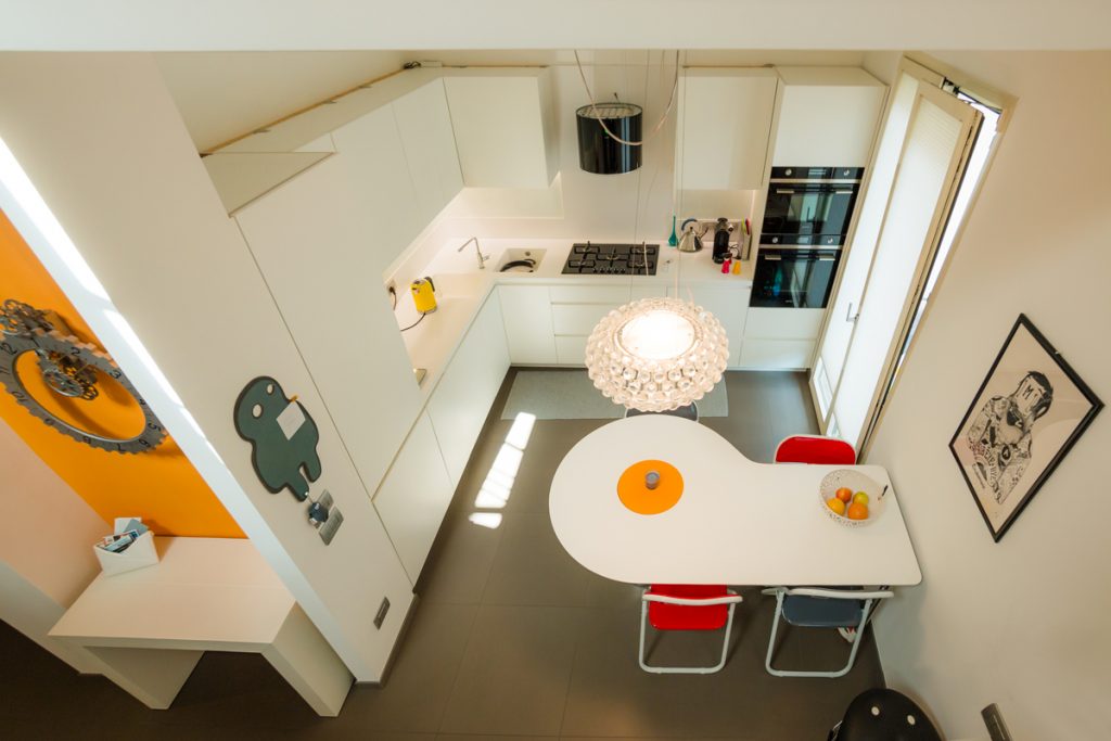Realizzato da Modulor, Omelette è un tavolo a penisola dal design simpatico e funzionale, creato per rispondere all'esigenza di un piano d'appoggio asimmetrico, che combina una parte più larga e confortevole con una più stretta da appoggiare al muro.