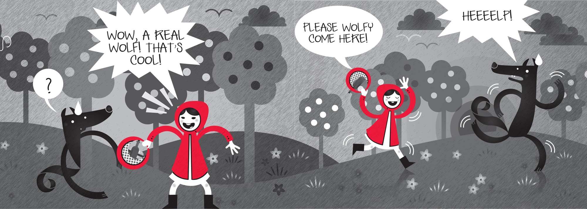 Questo progetto rappresenta una mia personale reinterpretazione grafica e narrativa della fiaba popolare di Cappuccetto Rosso, resa celebre dalle versioni di Charles Perrault e dei Fratelli Grimm. Qui, la trama prende una direzione inaspettata, sfidando le convenzioni e giocando con l'immaginario collettivo: il lupo, tradizionalmente dipinto come il simbolo del male, perde il suo oscuro ruolo per diventare un timido e spaventato animaletto. Quando Cappuccetto Rosso, con innocenza e curiosità, gli rivolge uno sguardo amichevole, il lupo, lontano dall’essere un predatore, fugge in preda al terrore, cercando rifugio dalla bambina stessa.